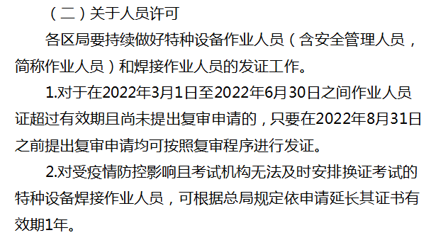 2.對受疫情防控影響且考試機構無法及時安排換證考試的特種設備焊接作業人員,可根據總局規定依申請延長其證書有效期1年。